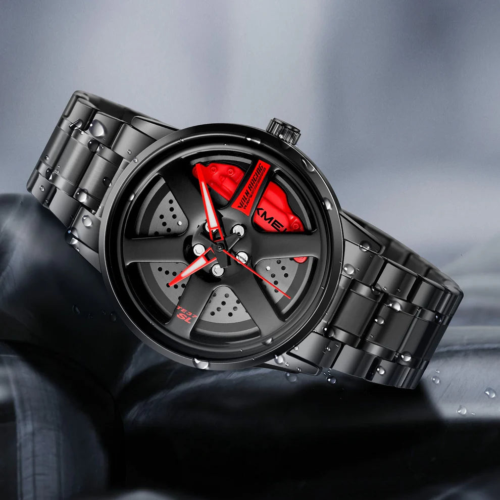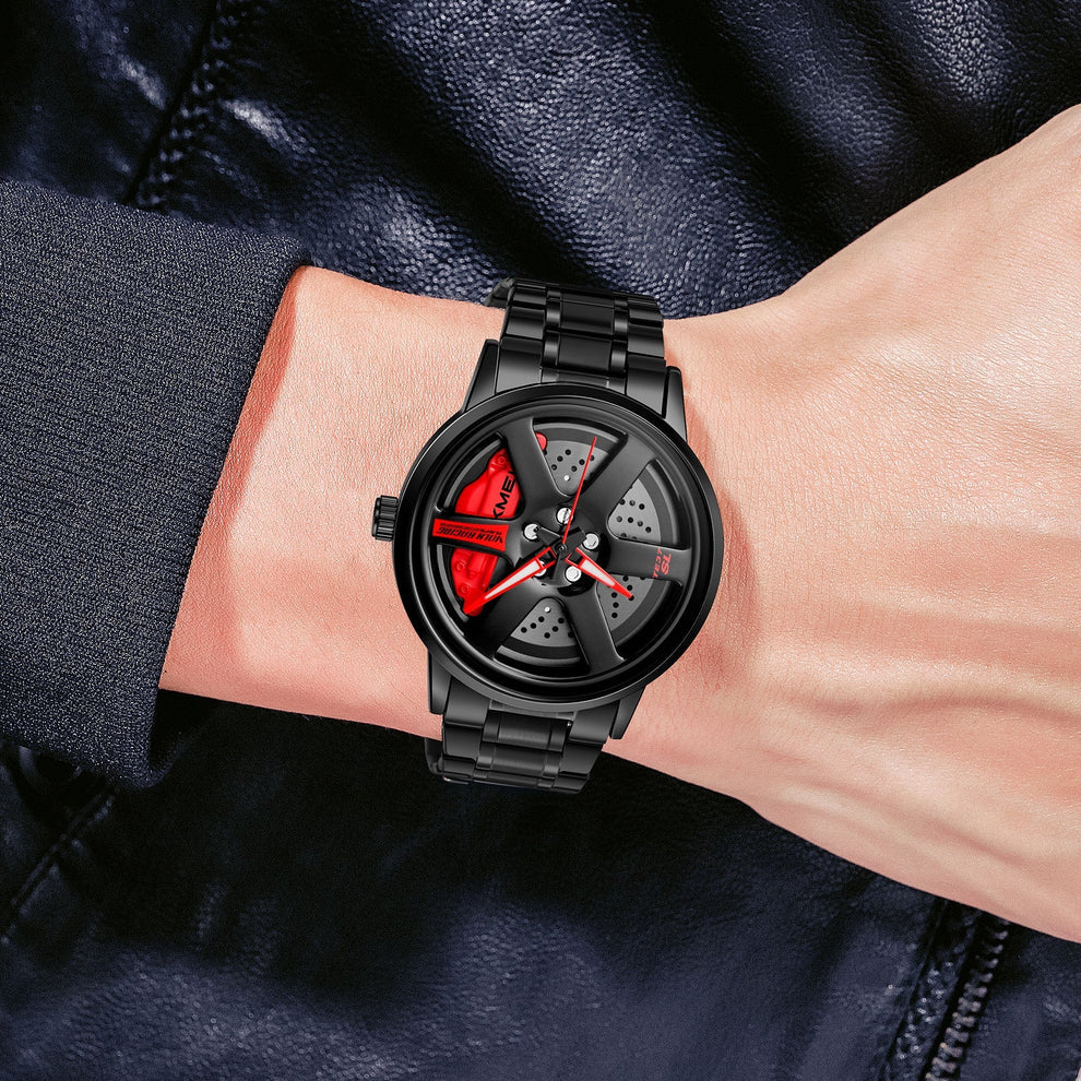New Car Wheel Watch with Rolling Creative Fashion Analog Watch, Black Dial Zink Alloy Case Men's Watch, Stainless Steel Black Color Band, Quartz Movement, Water & Scratch-Resistant-199 ⭐⭐⭐⭐⭐(4.9/5)